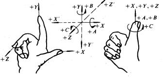 | 字符編碼標準與加工程序指令標準化 以前廣泛采用數控穿孔紙帶作為加工程序信息輸入介質,常用的標準紙帶有五單位和八單位兩種,數控機床多用八單位紙帶。紙帶上表示代碼的字符及其穿孔編碼標準有EIA (美國電子工業(yè)協(xié)會)制定的EIA RS-244和 ISO(國際標準化協(xié)會)制定的ISO-RS840兩種標準。國際上大都采用ISO代碼,由于EIA代碼發(fā)展較早,已有的數控機床中,有一些是應用EIA 代碼的,現(xiàn)在我國規(guī)定新產品一律采用ISO代碼。也有一些機床,具有兩套譯碼功能,既可采用ISO代碼也可采用EIA代碼。 目前絕大多數數控系統(tǒng)采用通用計算機編碼,并提供與通用微型計算機完全相同的文件格式,保存、傳送數控加工程序,因此,紙帶已逐步被現(xiàn)代化的信息介質所取代。 除了字符編碼標準外,更重要的是加工程序指令的標準化,主要包括準備功能碼(G代碼)、輔助功能碼(M代碼)及其它指令代碼。 我國機械工業(yè)部制定了有關G代碼和M代碼的JB3202-1983標準,它與國際上使用的ISO1056-1975E標準基本一致。 數控機床的坐標系定義 數控機床通過各個移動件的運動產生刀具與工件之間的相對運動來實現(xiàn)切削加工。為表示各移動件的移動方位和方向(機床坐標軸),在ISO標準中統(tǒng)一規(guī)定采用右手直角笛卡兒坐標系對機床的坐標系進行命名,在這個坐標系下定義刀具位置及其運動的軌跡。 機床坐標的命名方法如圖所示: