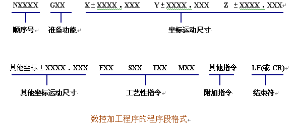 通常在坐標軸命名或編程時,不論在加工中是刀具移動,還是被加工工件移動,都一律假定工件相對靜止不動而刀具在移動,并同時規(guī)定刀具遠離工件的方向作為坐標軸的正方向。在坐標軸命名時,如果把刀具看作相對靜止不動,工件移動,那么,在坐標軸的符號上應加注標記('),如X'、Y'、Z'等。 確定機床坐標軸,一般是先確定Z軸,再確定X軸和Y軸。 1.確定Z軸 對于有主軸的機床,如車床、銑床等則以機床主軸軸線方向作為Z軸方向。對于沒有主軸的機床,如刨床,則以與裝卡工件的工作臺相垂直的直線作為Z軸方向。如果機床有幾個主軸,則選擇其中一個與機床工作臺面相垂直的主軸作為主要主軸,并以它來確定Z軸方向。 2.確定X軸 X軸一般位于與工件安裝面相平行的水平面內。對于機床主軸帶動工件旋轉的機床,如車床、磨床等,則在水平面內選定垂直于工件旋轉軸線的方向為X軸,且刀具遠離主軸軸線方向為X軸的正方向。對于機床主軸帶動刀具旋轉的機床, 當主軸是水平的,如臥式銑床、臥式鏜床等,則規(guī)定人面對主軸,選定主軸左側方向為X軸正方向;當主軸是豎直時,如立式銑床、立式鉆床等,則規(guī)定人面對主軸,選定主軸右側方向為X軸正方向。對于無主軸的機床,如刨床,則選定切削方向為X軸正方向。 3.確定Y軸 Y軸方向可以根據已選定的Z、X軸方向,按右手直角坐標系來確定。 坐標運動命名 如果機床除有X、Y、Z主要直線運動之外,還有平行于它們的坐標運動,則應分別命名為U、V、W。如果還有第三組運動,則應分別命名為P、Q、R。如在第一組回轉運動A、B和C的同時,還有第二組回轉運動,可命名為D或E等。 數控加工程序的程序段格式