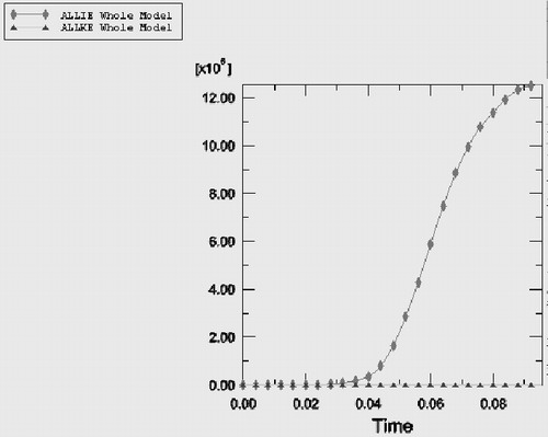 本實例模擬油箱的沖壓成型過程。圖3所示為實際成型時油箱的一半的形狀。考慮到在沖壓成型過程中,油箱結(jié)構的對稱性,本文通過模擬圖3左下所示的結(jié)構,對其進行模擬分析,達到分析整個油箱成型的目的。首先,通過ABAQUS/CAE完成圖3右側(cè)所示的裝配圖,其中平面鋁板將被沖壓成型為圖3左下的結(jié)構。成形的全過程如圖4所示,模擬結(jié)果跟實際生產(chǎn)過程相吻合。其中,圖5所示為整個過程中內(nèi)能和動能的變化曲線,可以確定模擬過程為準靜態(tài)。圖6表現(xiàn)的是成型后金屬板的厚度分布云圖。圖7給出了與厚度變化違禁詞處的單元相關的四個節(jié)點處的厚度在時間域內(nèi)的變化曲線。
